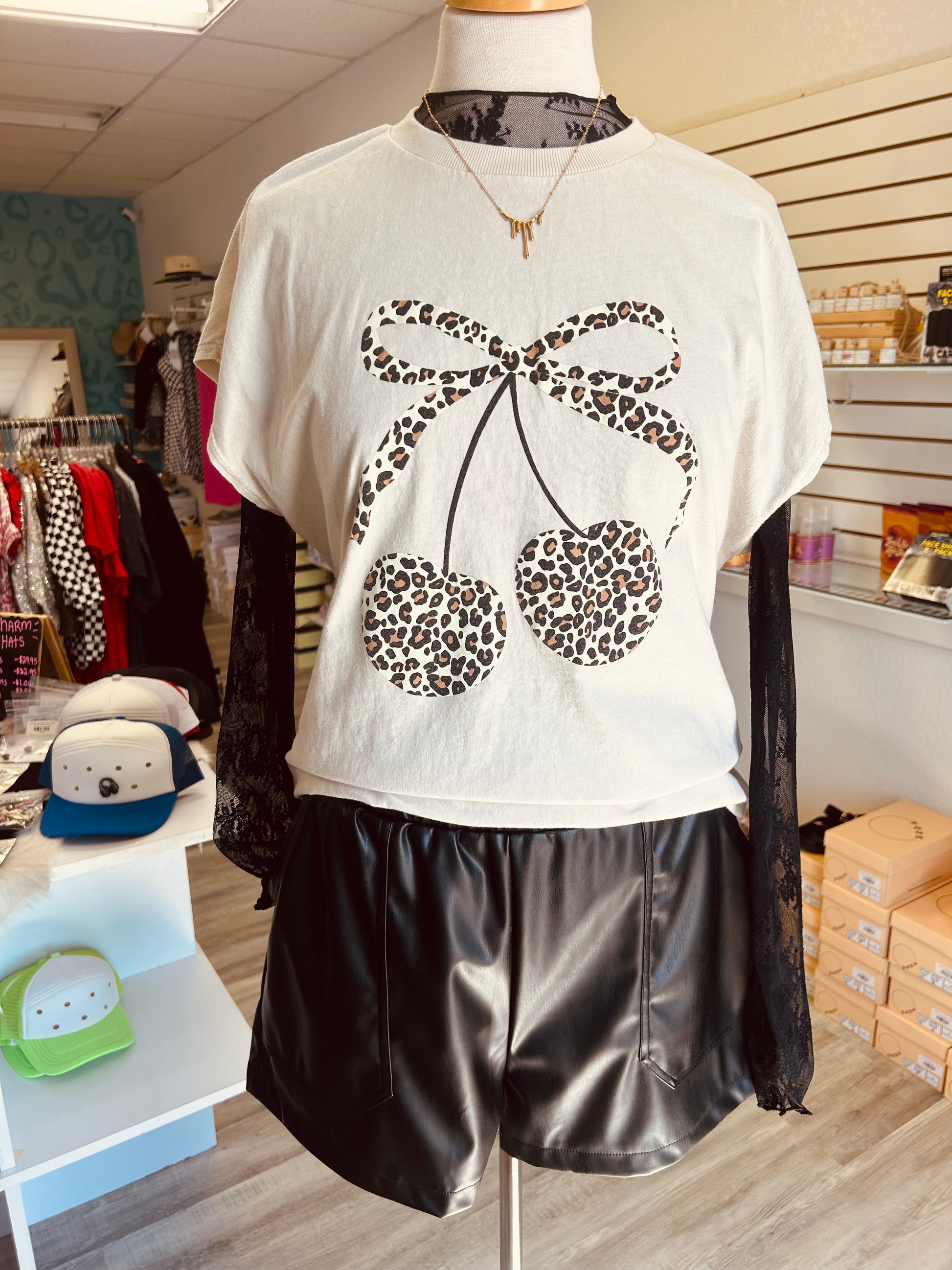 - This playful sleeveless tee features a fun animal print cherry design that adds a quirky twist to your casual look.
