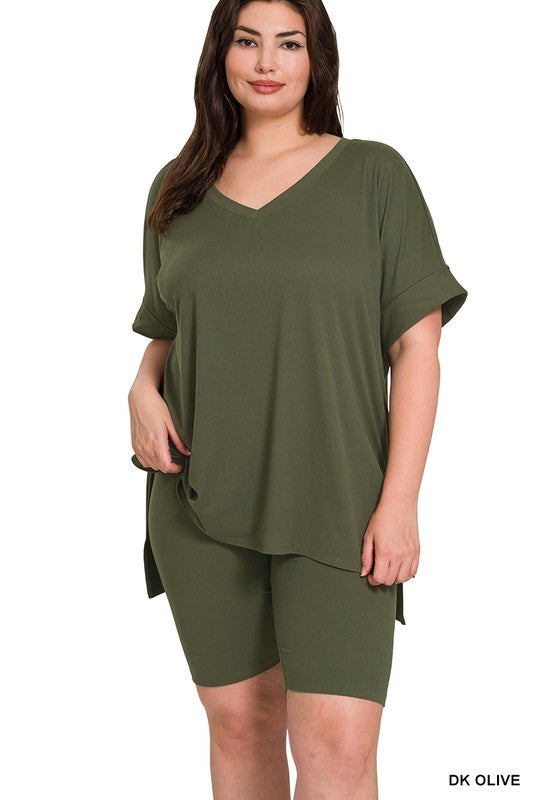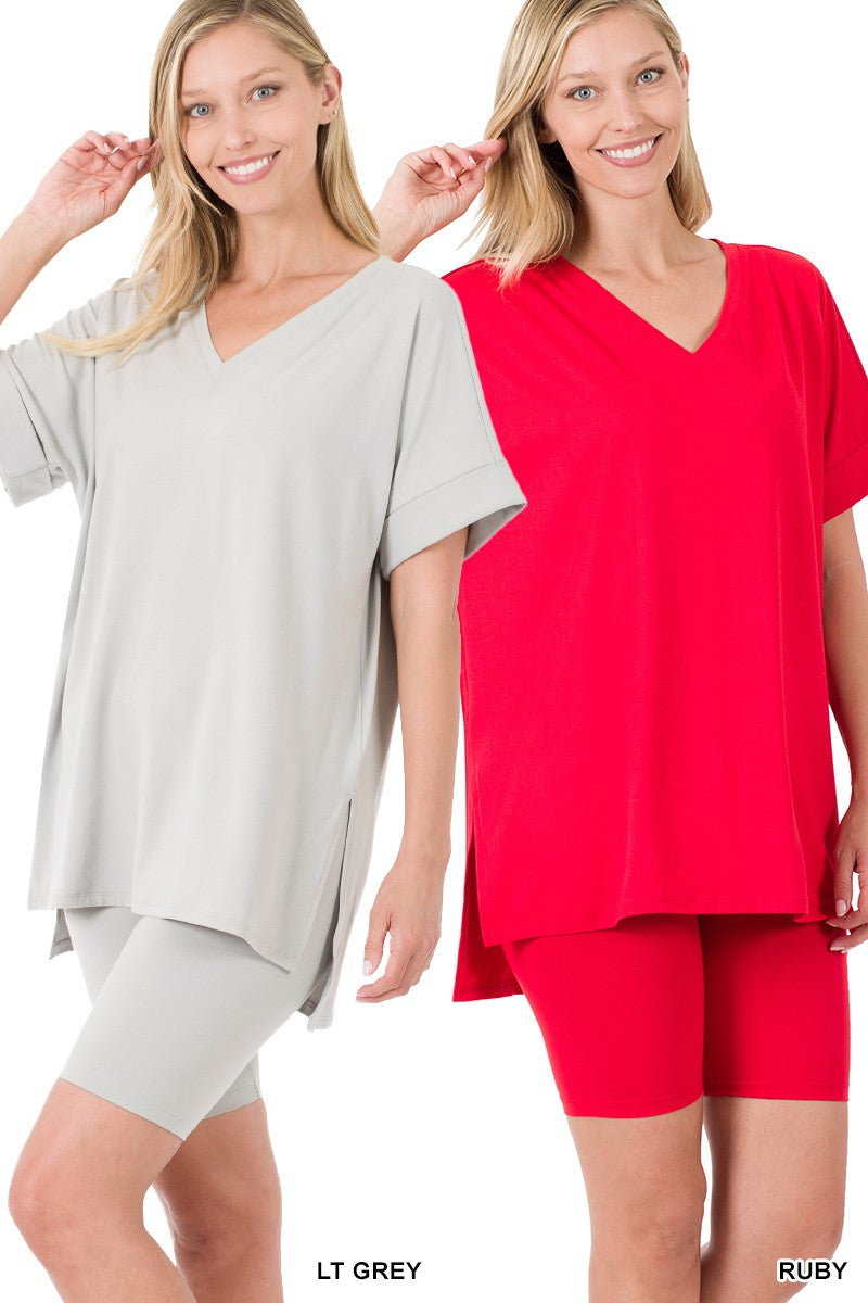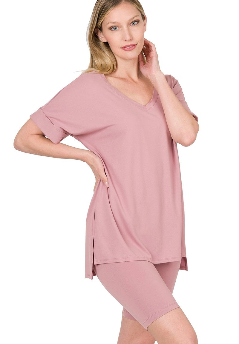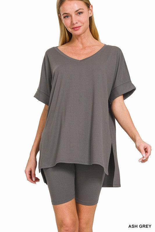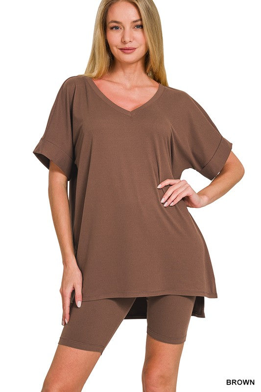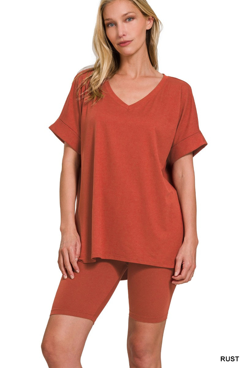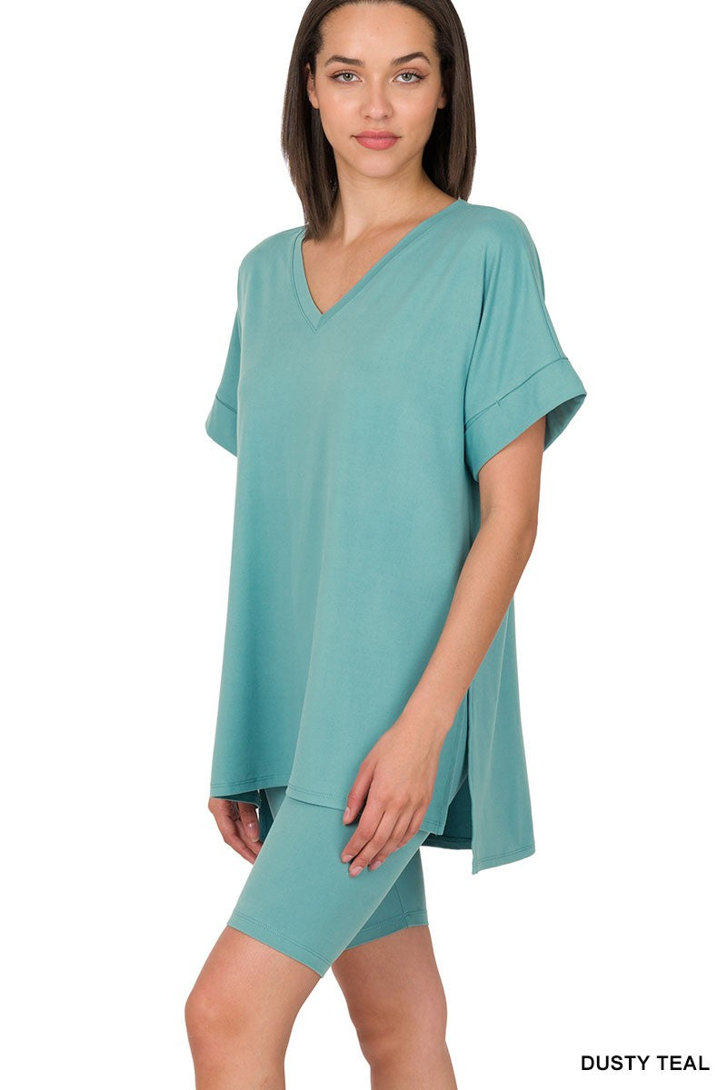- This V-neck top & biker short set will be your go-to outfit on those mornings when time is not on your side!