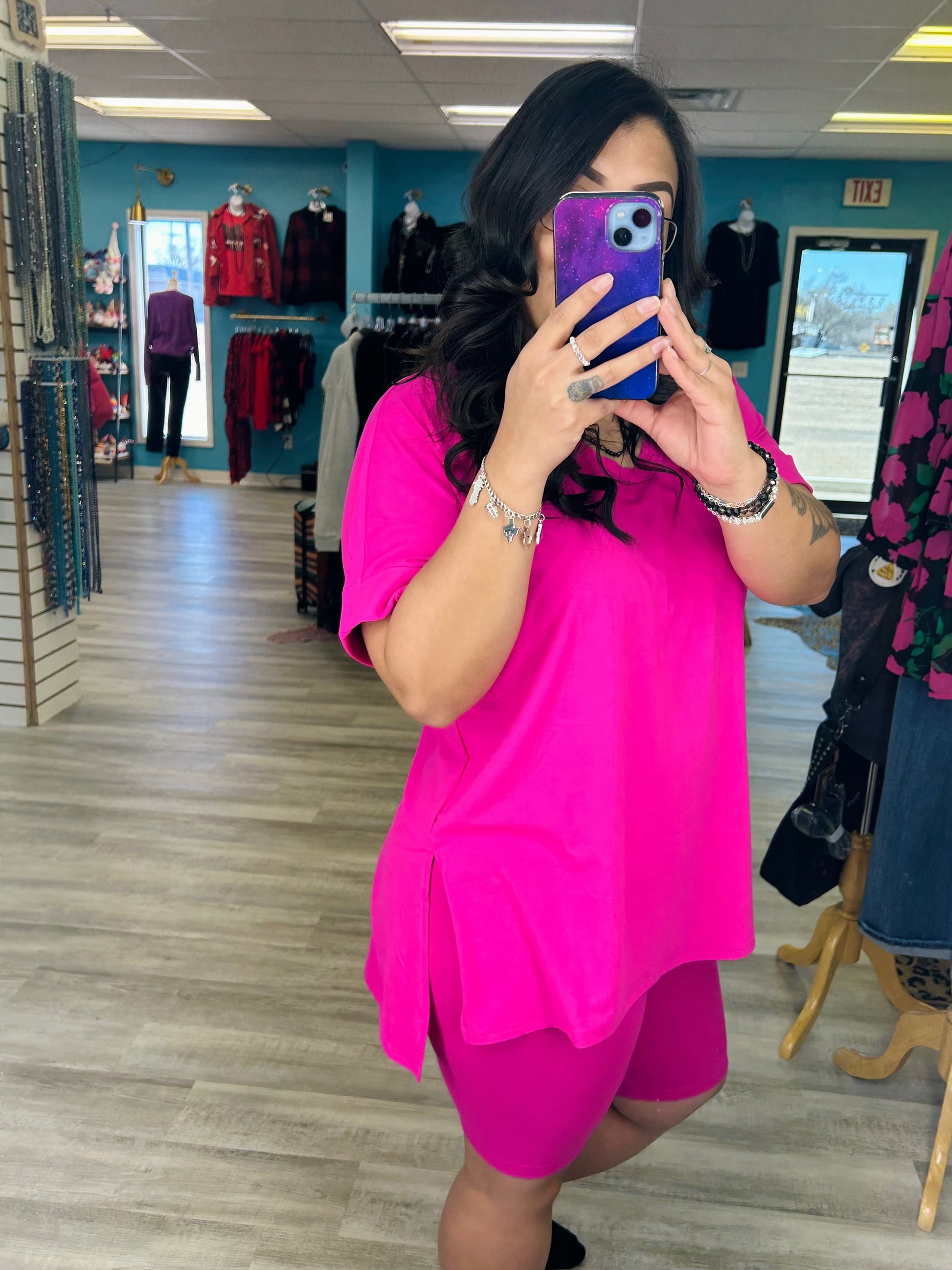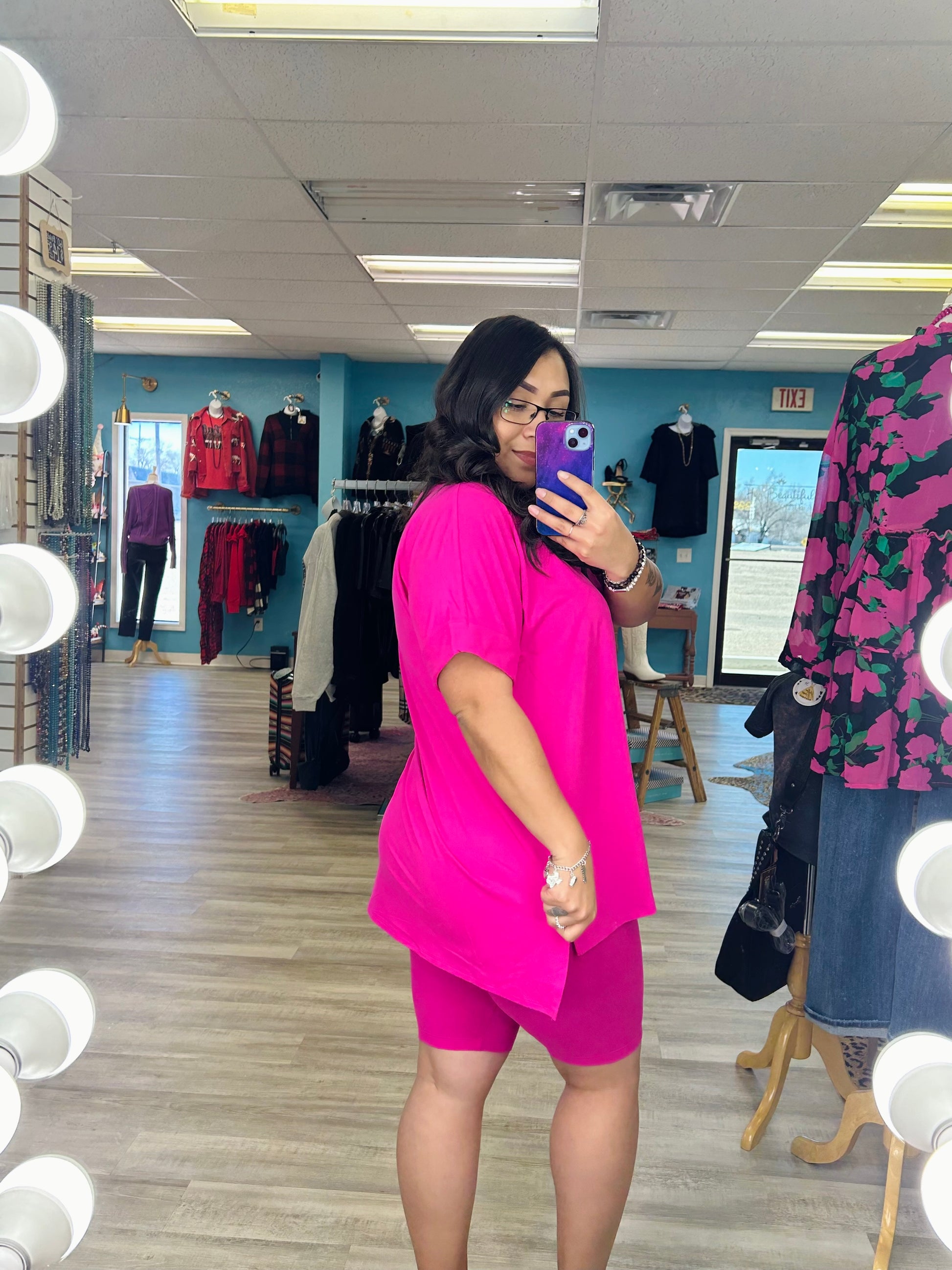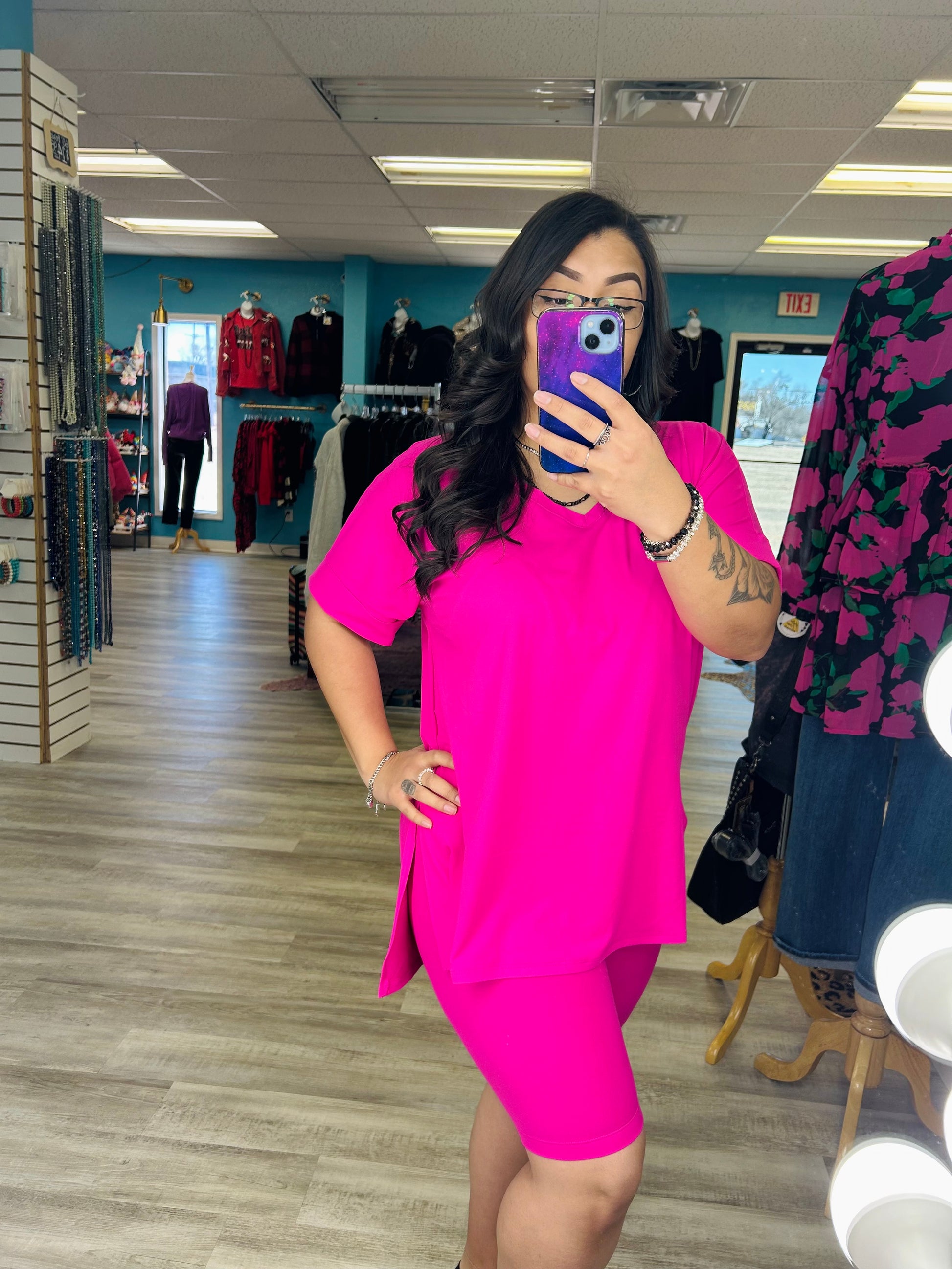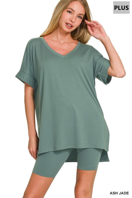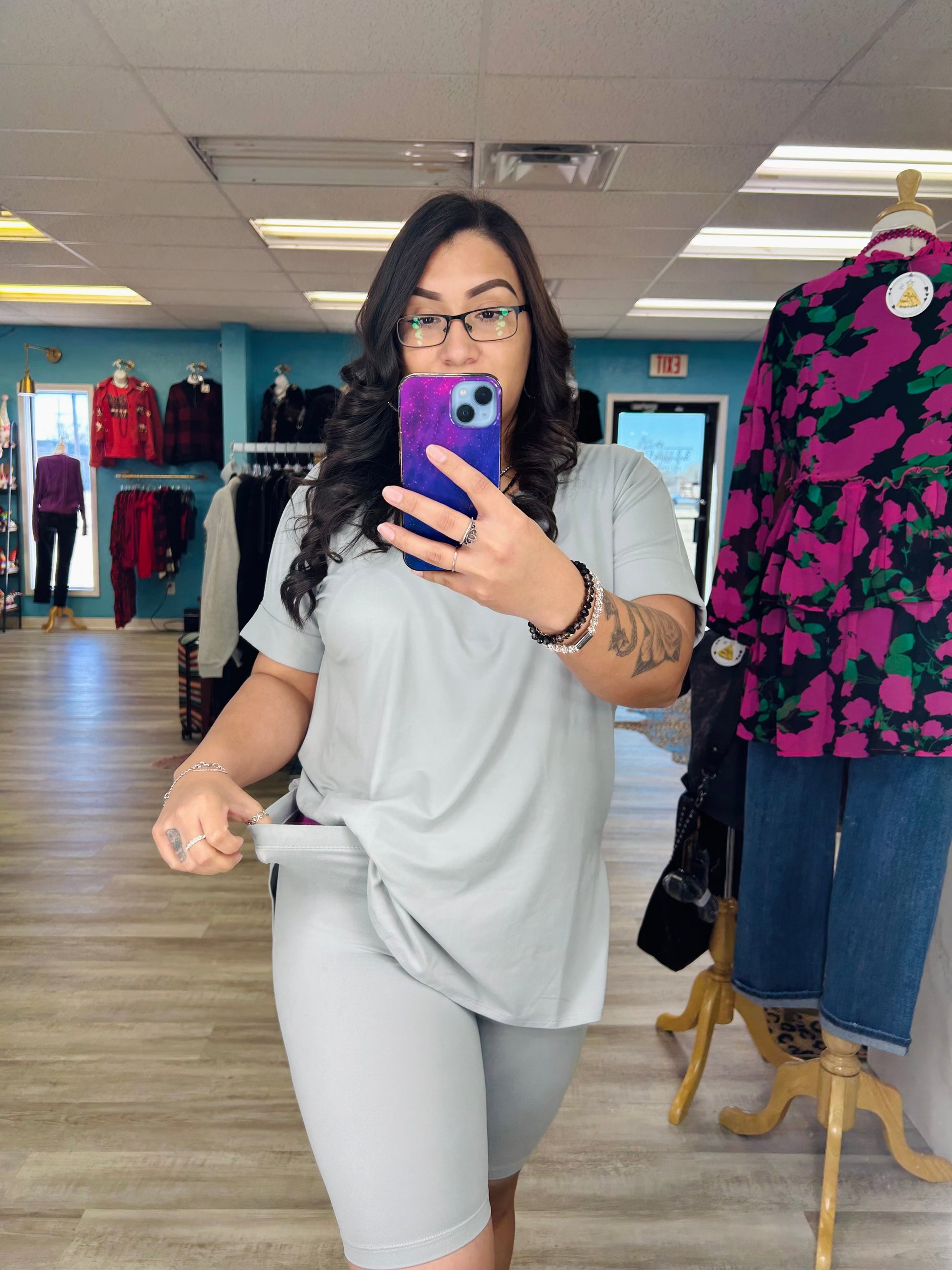 - This V-neck top & biker short set will be your go-to outfit on those mornings when time is not on your side!