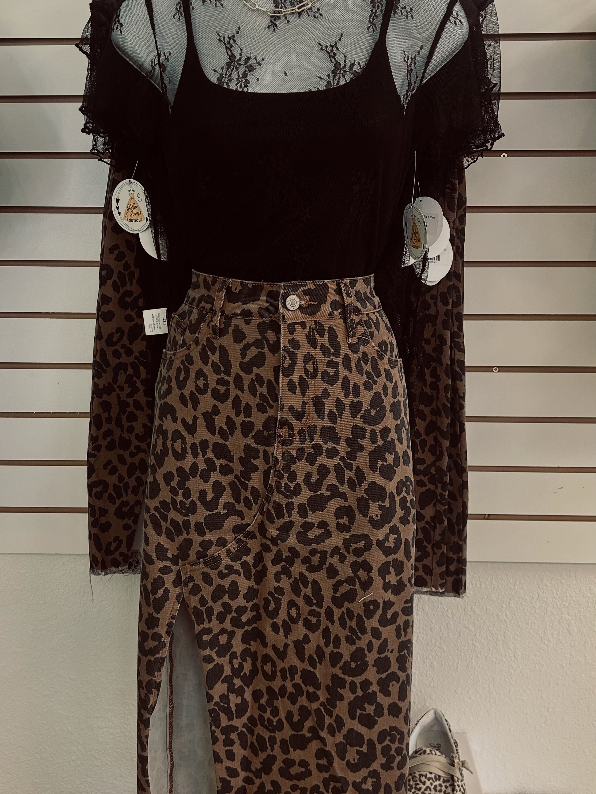 - Unleash your inner wild side with this leopard print midi skirt featuring a bold front slit.